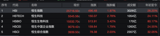 11月24日,港股三大指数集体大涨。截至收盘,恒生指数涨1.97%,报收于25716.50点;恒生国企指数涨1.79%,报收于9079.42点;恒生科技指数涨2.78%,报收于5545.56点。全日大市成交额为3026亿港元,南向资金净买入85.71亿港元。