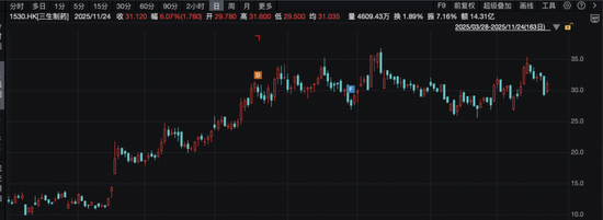 11月24日,创新药概念股涨幅居前,三生制药涨6.07%,恒瑞医药涨5.61%,翰森制药涨5.29%,药明康德涨5.12%。