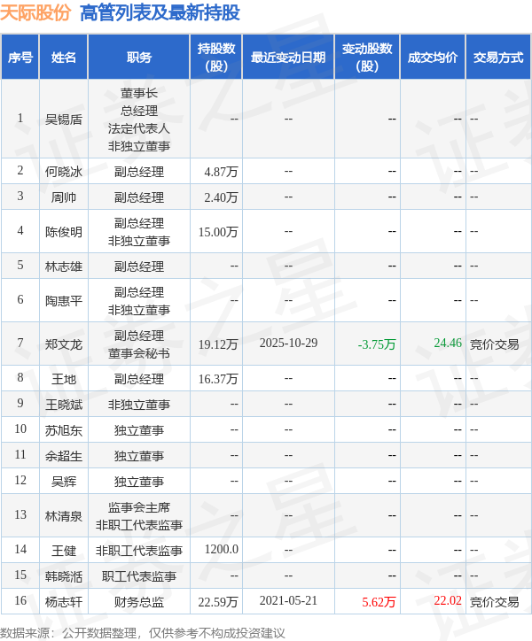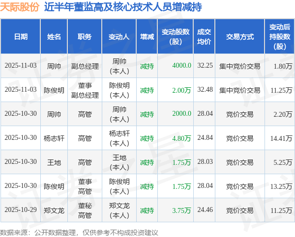 天际股份近半年内的董监高及核心技术人员增减持详情如下: