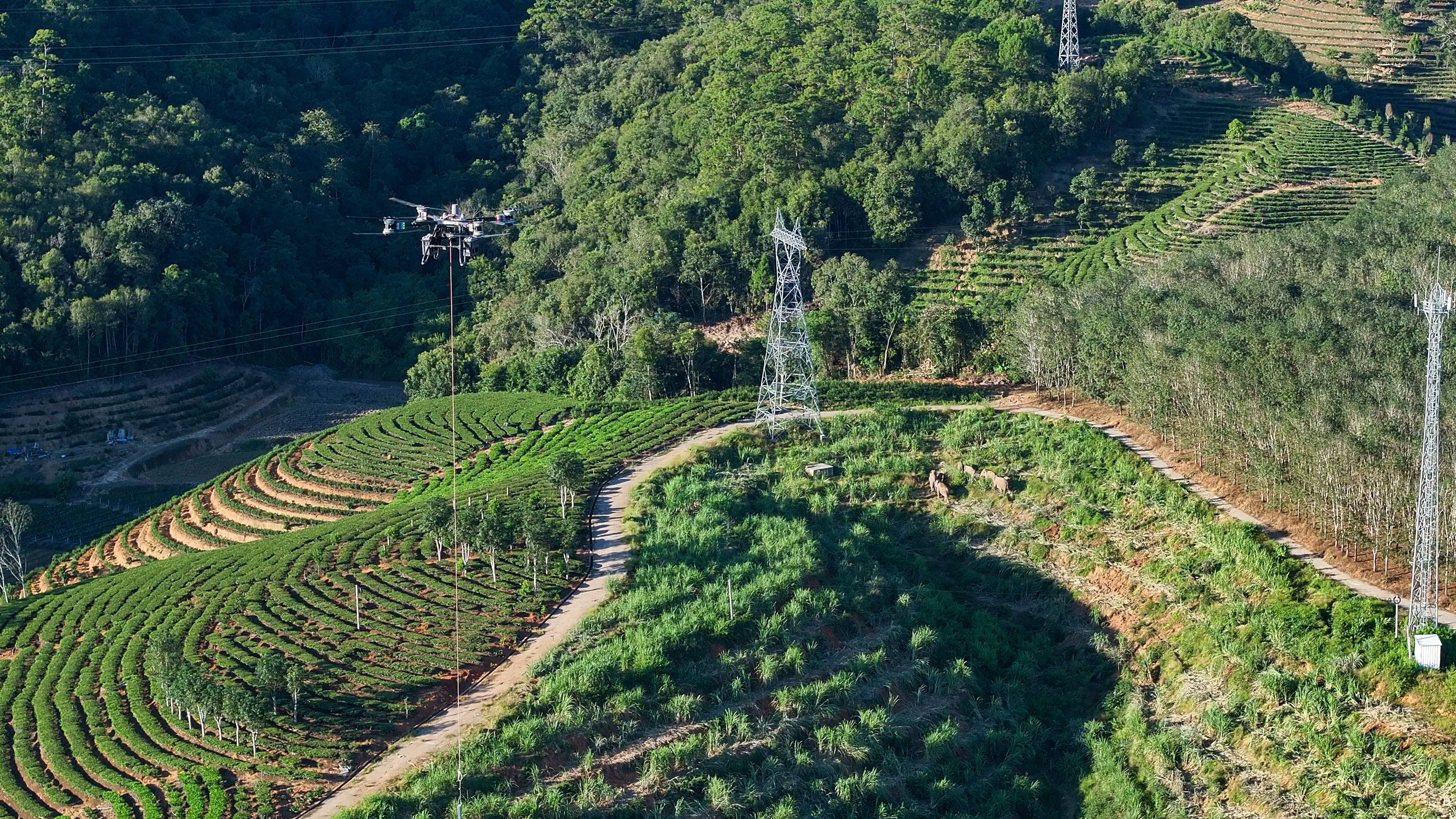 中老500千伏联网工程在施工过程中运用无人机集群作业方式开展施工物资运输。(张强 摄)“增加成本也要最大限度保护雨林生态。”付卫斌说。最终评审会上,团队决定放弃传统施工方式,追加约1000万元成本,保住103亩原始雨林。