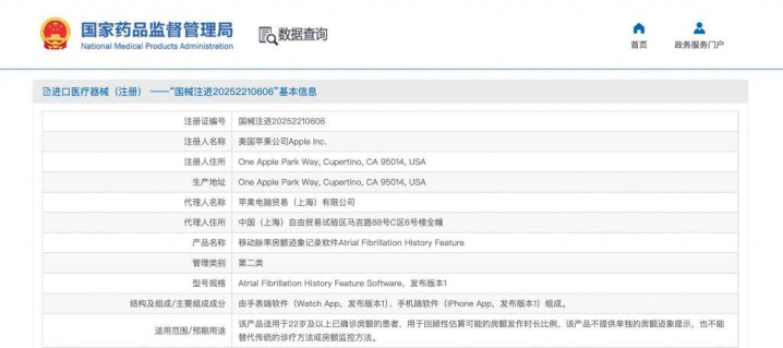国家药品监督管理局官网公示,美国苹果公司的「移动脉率房颤迹象记录软件」已经在 2025 年 12 月 26 日完成医疗器械进口注册。