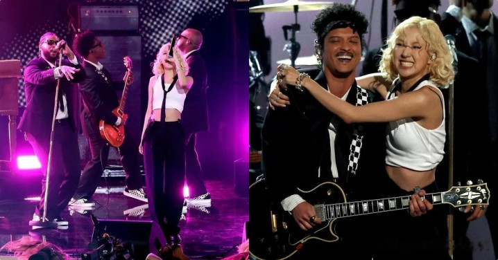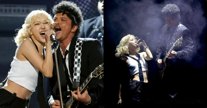 在典礼中,Rosé居然与「火星哥布鲁诺(Bruno Mars)」合体啦!在国际盛事上带来在全世界掀起热舞风潮的合作曲〈APT.〉,一开场Rosé已经换上白色短版上衣、黑色吊带裤、戴上领带以及墨镜「俏皮变身」,本来靠着布鲁诺的他,调皮地趁对方在努力伴奏『重重亲上布鲁诺的脸颊』,展现亲密可爱的互动。