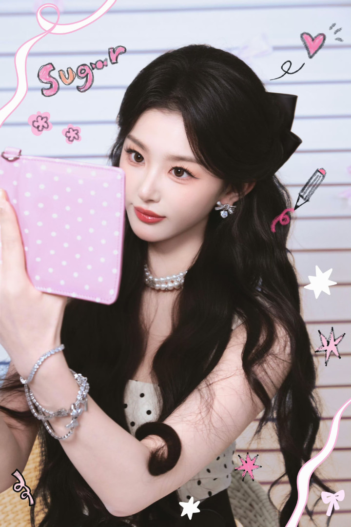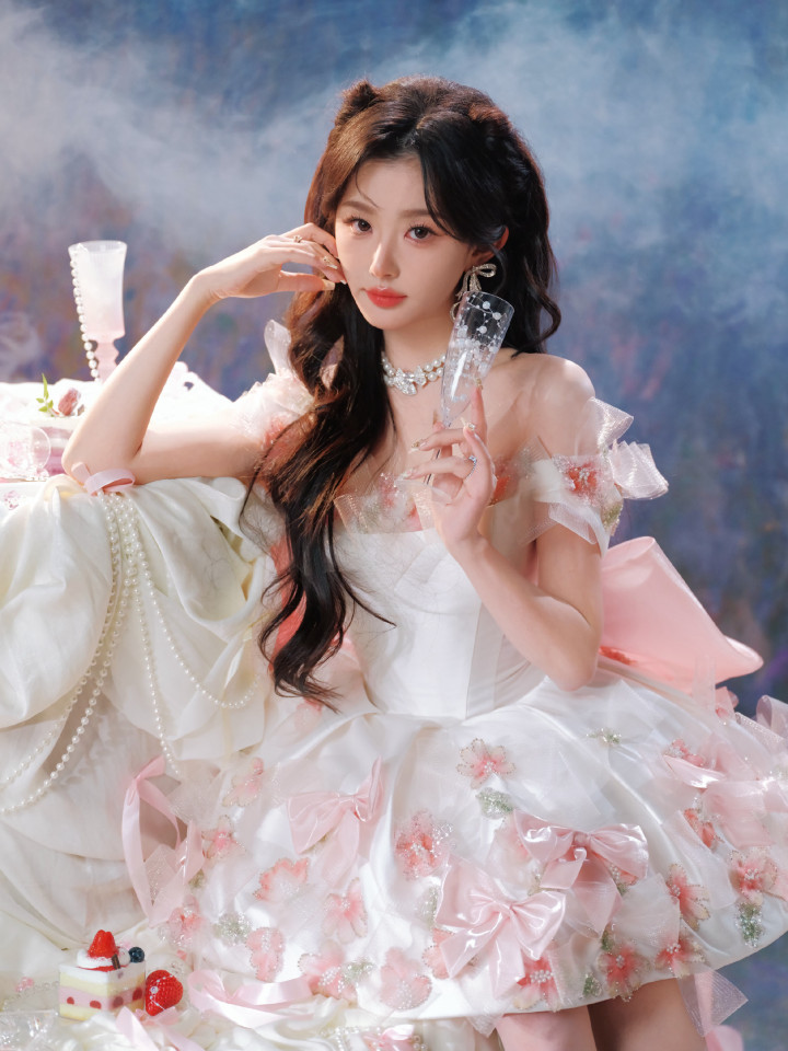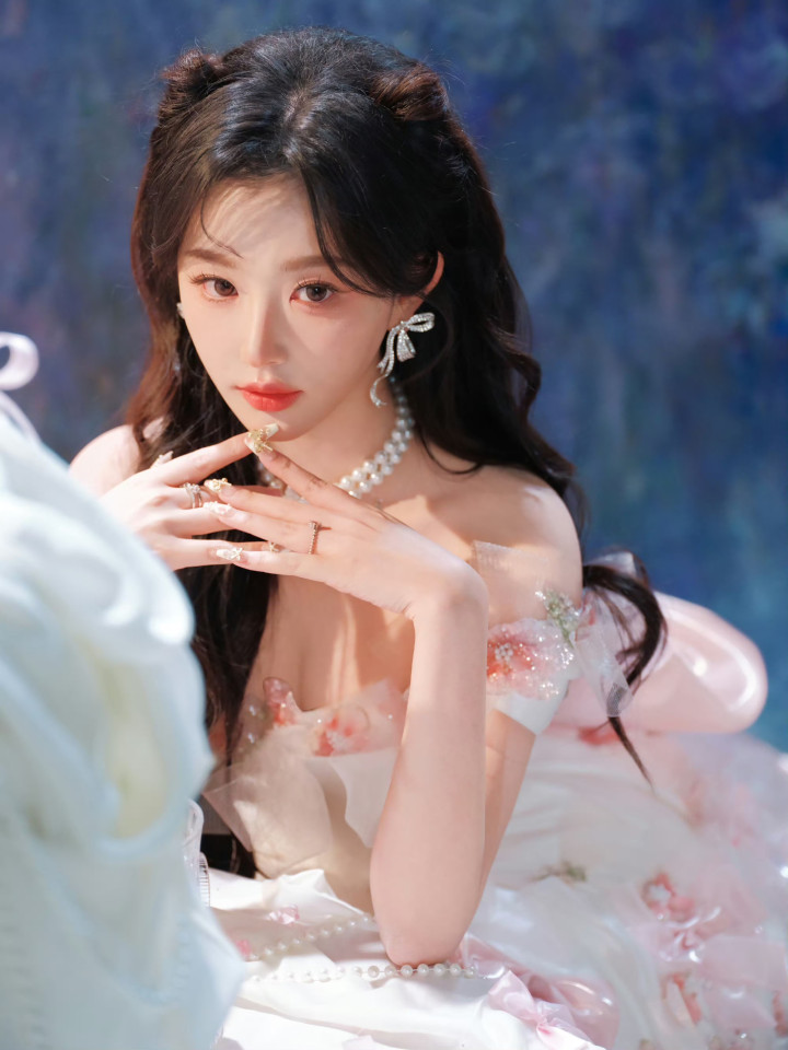身着粉白相间的公主裙,孔雪儿像从童话里走出来的甜妹。蓬松的裙摆缀着精致的粉色花朵,层层薄纱轻裹着少女的娇俏,珍珠项链与蝴蝶结耳饰衬得她眉眼愈发温柔。