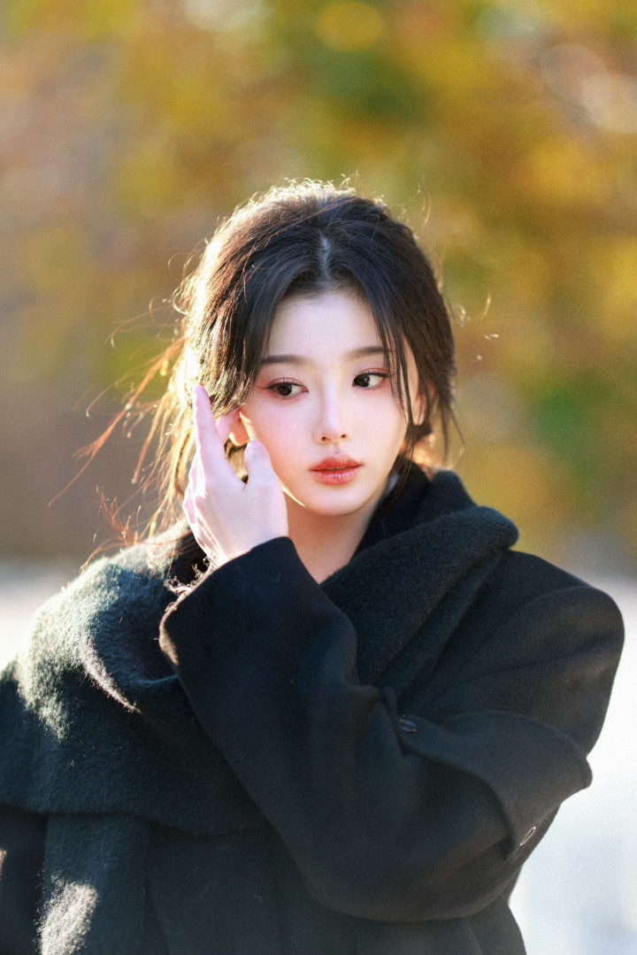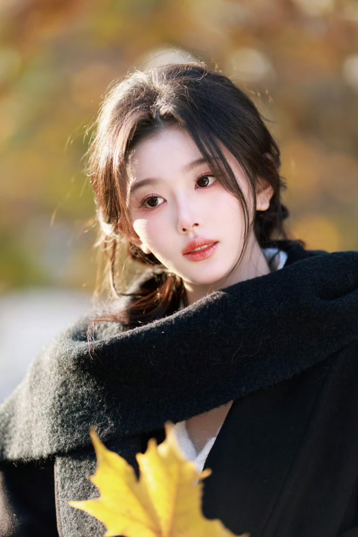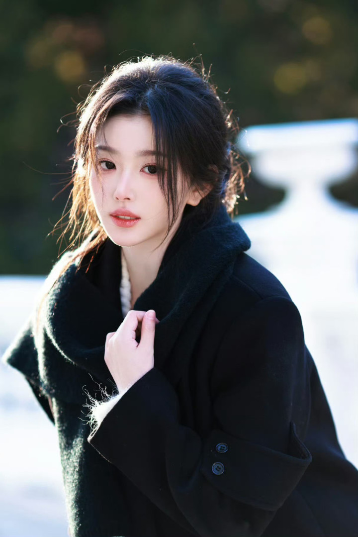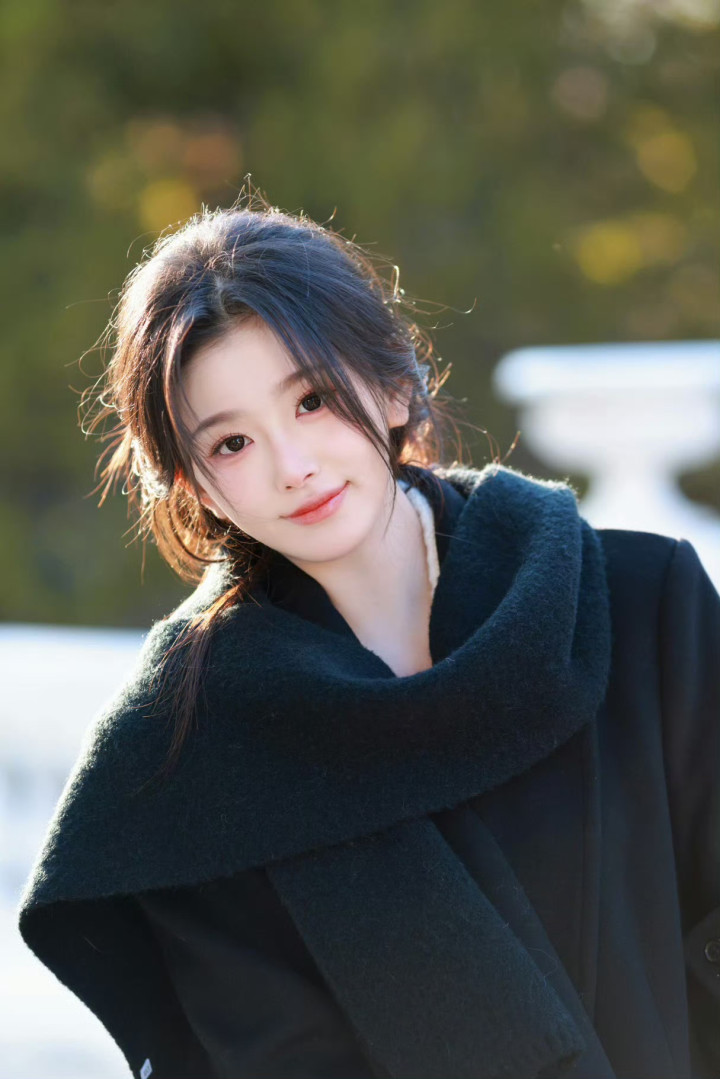 裹着深绿色围巾的孔雪儿,甜妹气质里多了几分冬日的温柔。简约的黑色大衣衬得身形纤细,发丝被微风轻拂,暖光落在笑眼上,甜意顺着眉眼漫进人心。