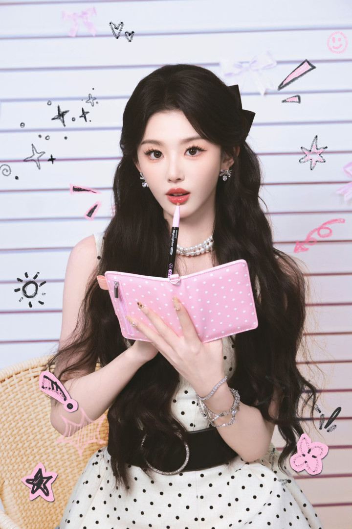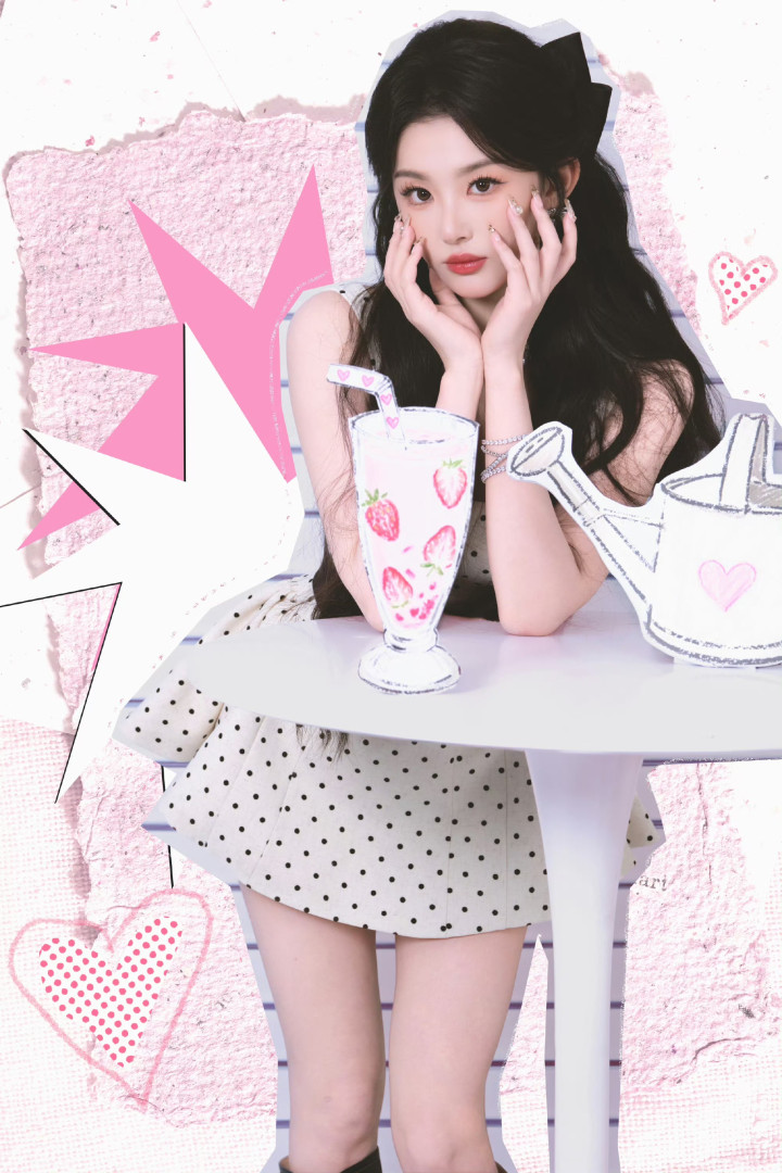 她双手托腮倚在桌边,望向镜头的眼神灵动又清澈,面前的草莓饮品与爱心洒水壶,将少女的元气与可爱烘托得愈发鲜活,连空气里都飘着软乎乎的甜意。